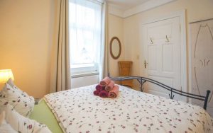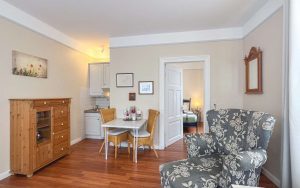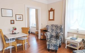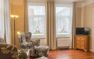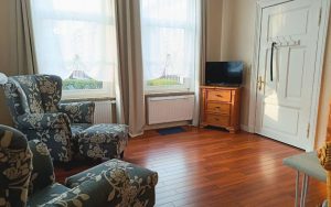 Das liebevoll eingerichtete Apartment „Maiglöckchen“ liegt im Erdgeschoß des Hauses und ist ausgestattet mit einem Wohnraum mit 2 gemütlichen Ohrensesseln, großem Fernseher und kleiner Kochzeile. Ein separates Schlafzimmer mit daran angrenzendem Duschbad.