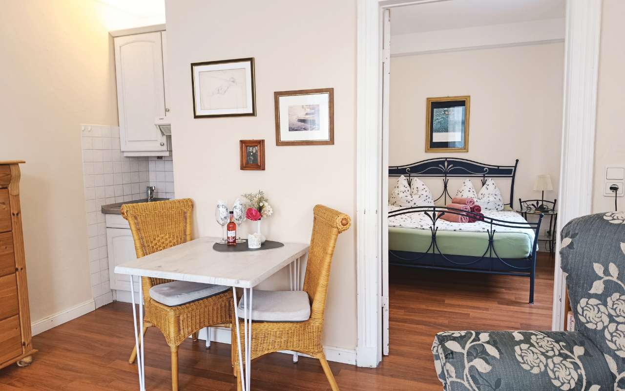Das liebevoll eingerichtete Apartment „Maiglöckchen“ liegt im Erdgeschoß des Hauses und ist ausgestattet mit einem Wohnraum mit 2 gemütlichen Ohrensesseln, großem Fernseher und kleiner Kochzeile. Ein separates Schlafzimmer mit daran angrenzendem Duschbad.