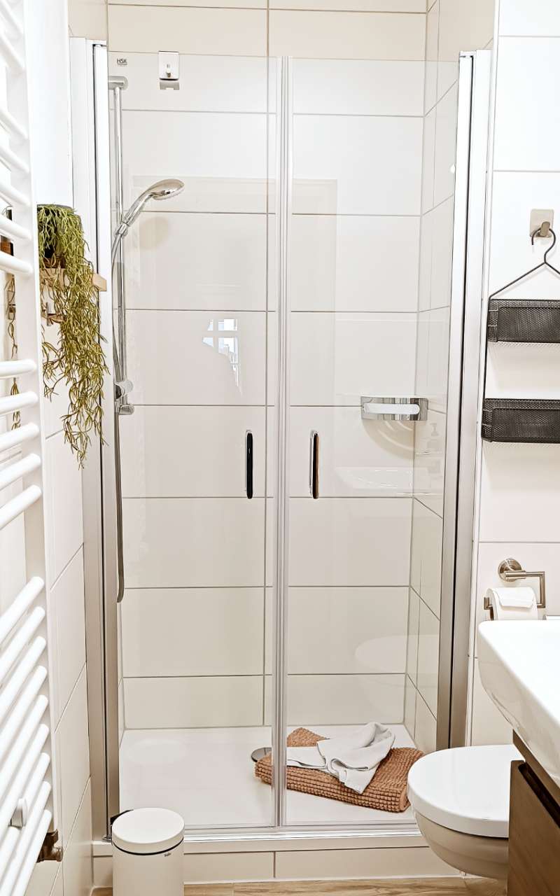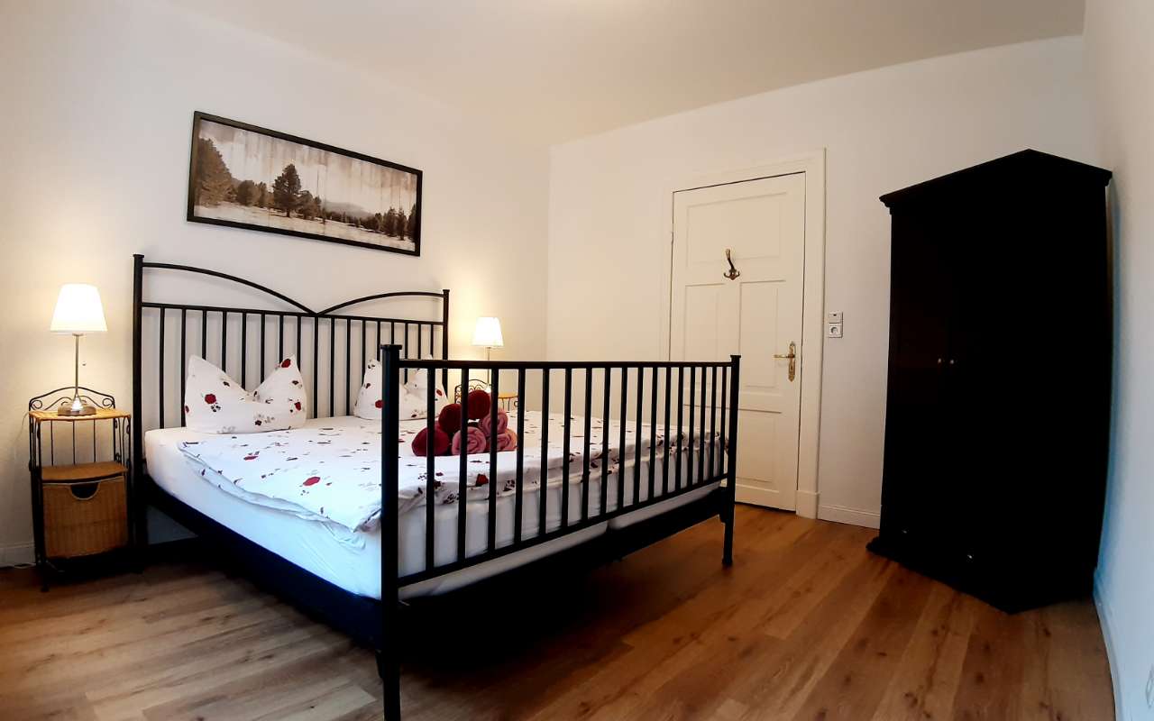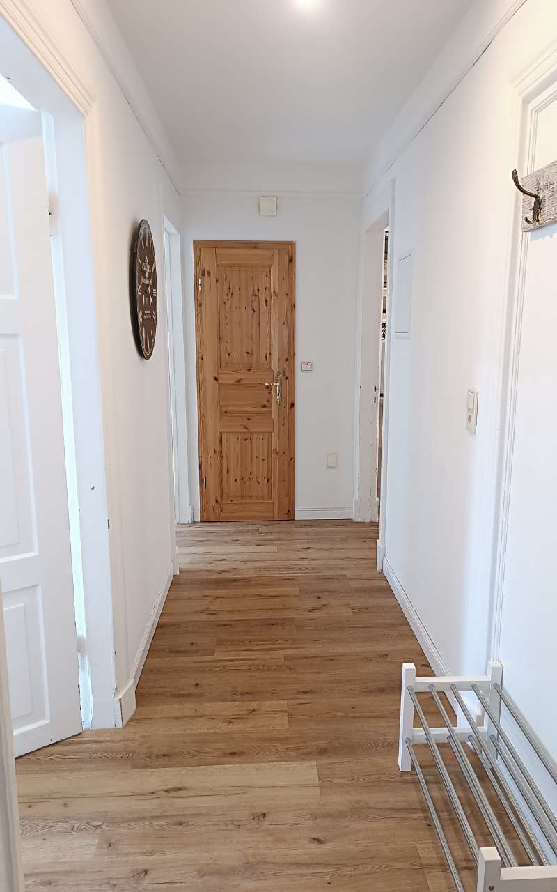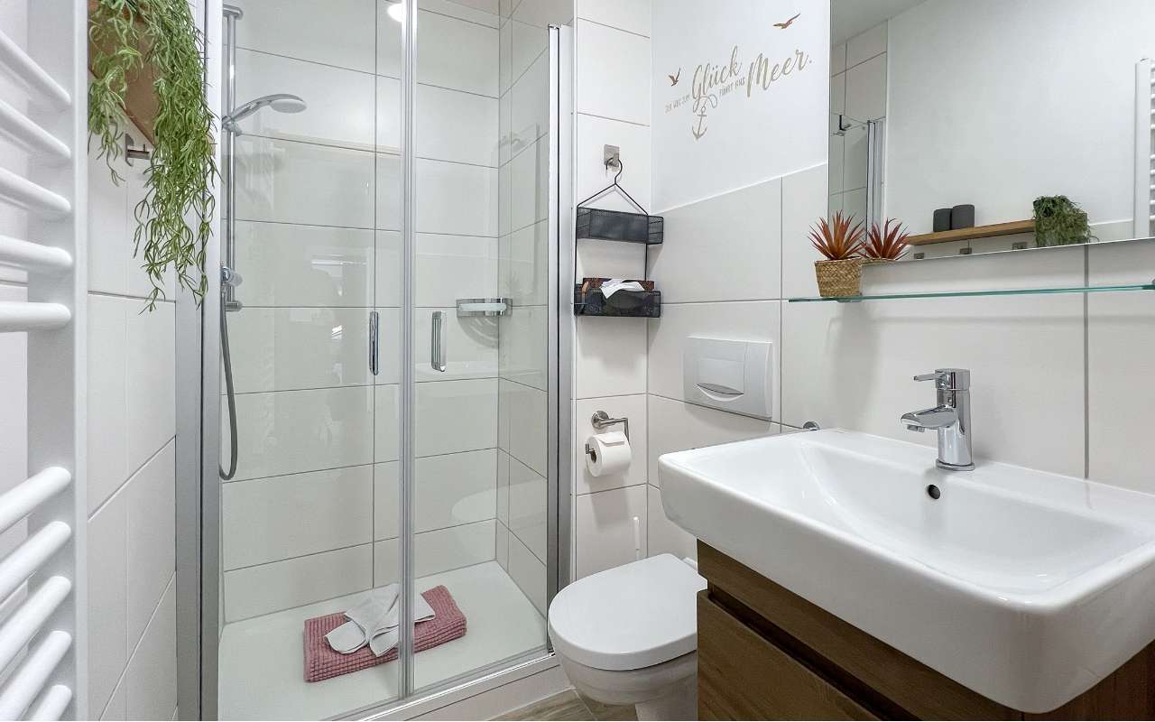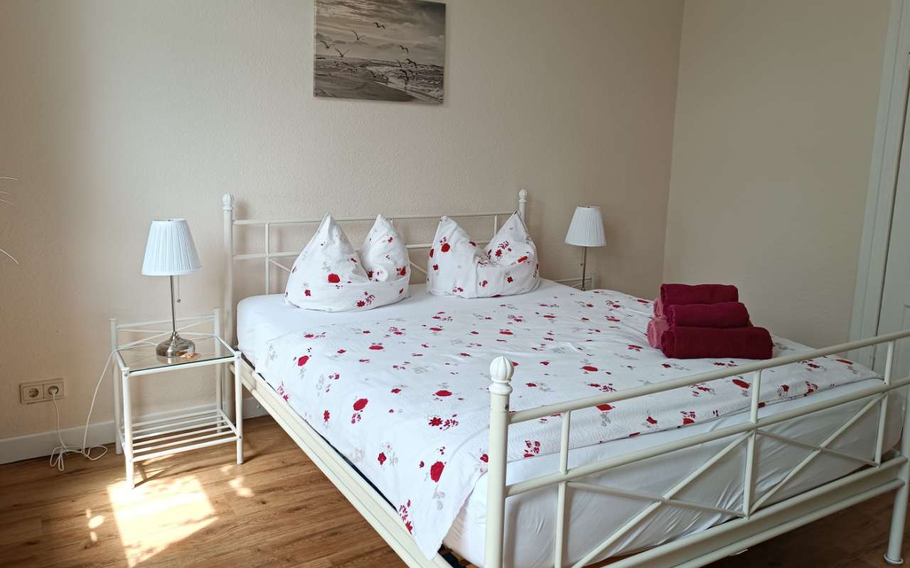 Das kleine Duschbad mit WC ist über den Flur zu erreichen. Es befindet sich im Vorflur ein zusätzliches Gäste WC, welches nicht zur Wohnung gehört, aber mit genutzt werden darf „wenn es eng wird“. Ein festes Kinderbett sowie ein Hochstuhl sind in der Wohnung. Die Betten (160 und 180x200cm) sind bei Ihrer Anreise bezogen und Handtücher stehen Ihnen natürlich ausreichend zur Verfügung.